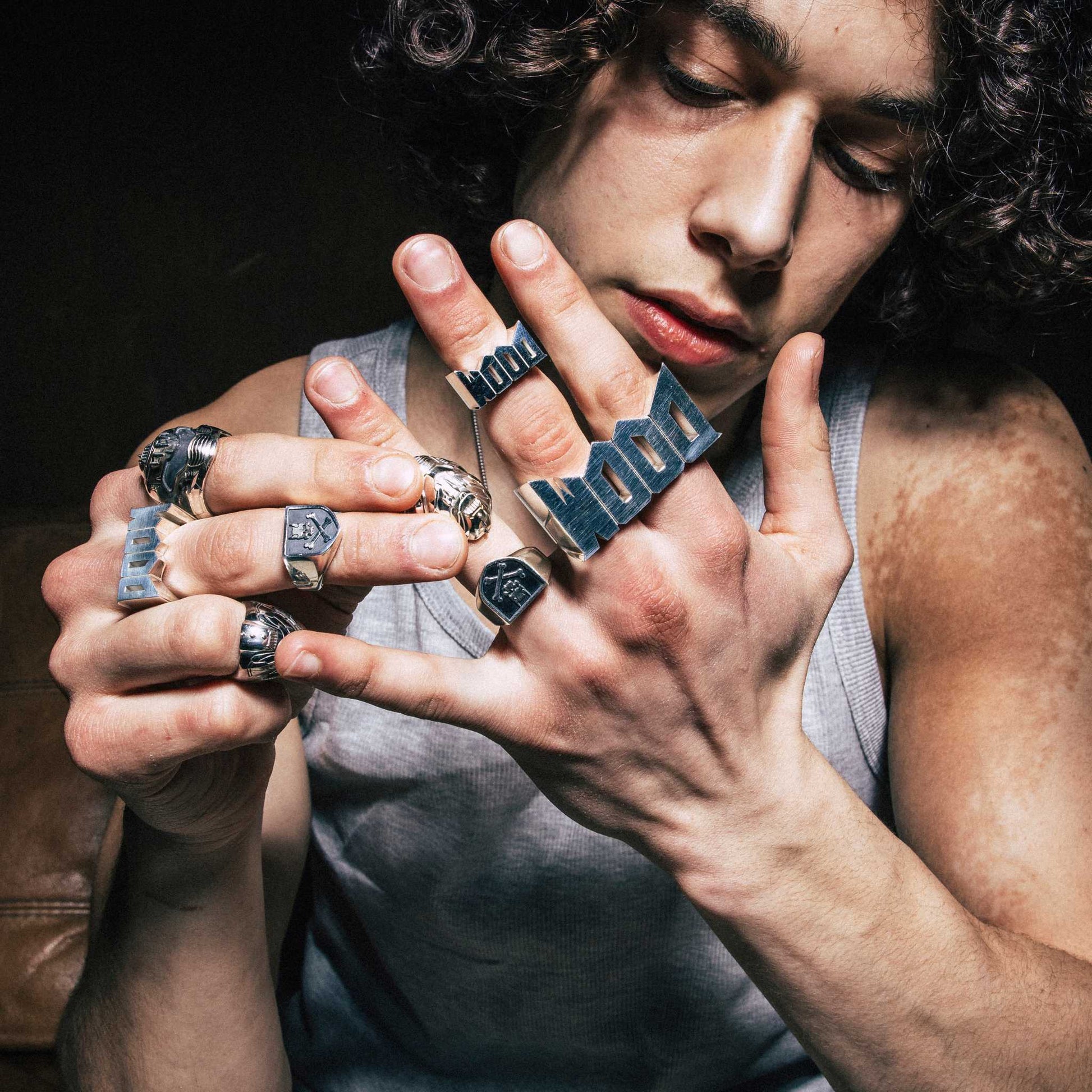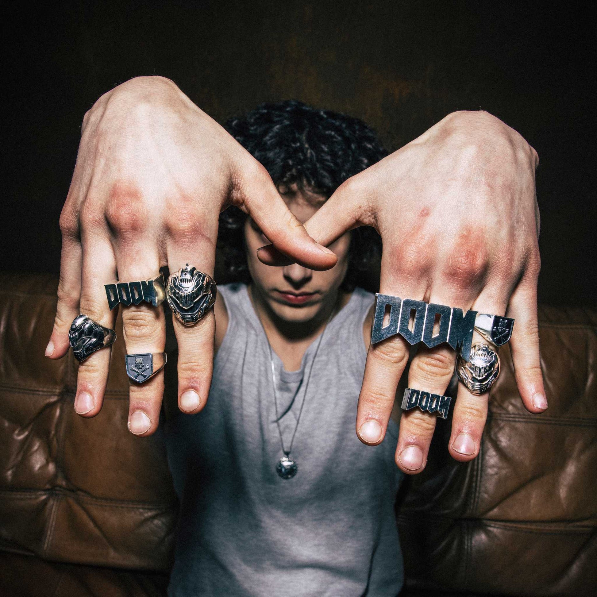 This two-finger knuckle ring is crafted in solid sterling silver and finished with a high-polish surface for a sharp, modern look. Featuring the unmistakable DOOM logo in angular block lettering, this is a statement piece forged for collectors and fans alike.